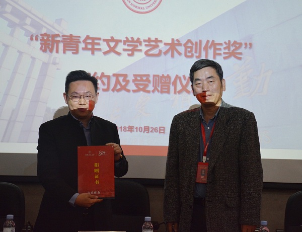 仪式伊始,熊剑峰简要介绍了捐赠方梁振华及其所设立“新青年文学艺术创作奖”的情况。梁振华与学院经理郑贤章签订捐赠协议,黎大志代表学校接受了捐赠支票,并为梁振华颁发捐赠证书。