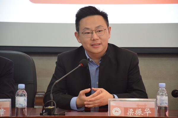 黎大志代表学校感谢梁振华为校庆献礼,并为梁振华点赞,他指出此次捐赠是对广大青年学子们的一次激励,鼓舞学子们热爱文学,追求艺术,首开风气,意义非凡。最后,他表达了对学校及学校未来发展的美好祝愿。