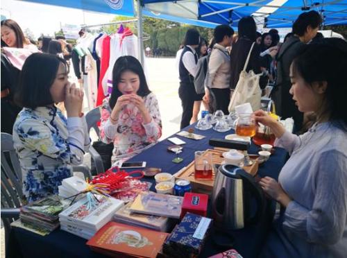 圆光大学孔院活动展台凭借中国书画、传统服装和茶艺等获得好评