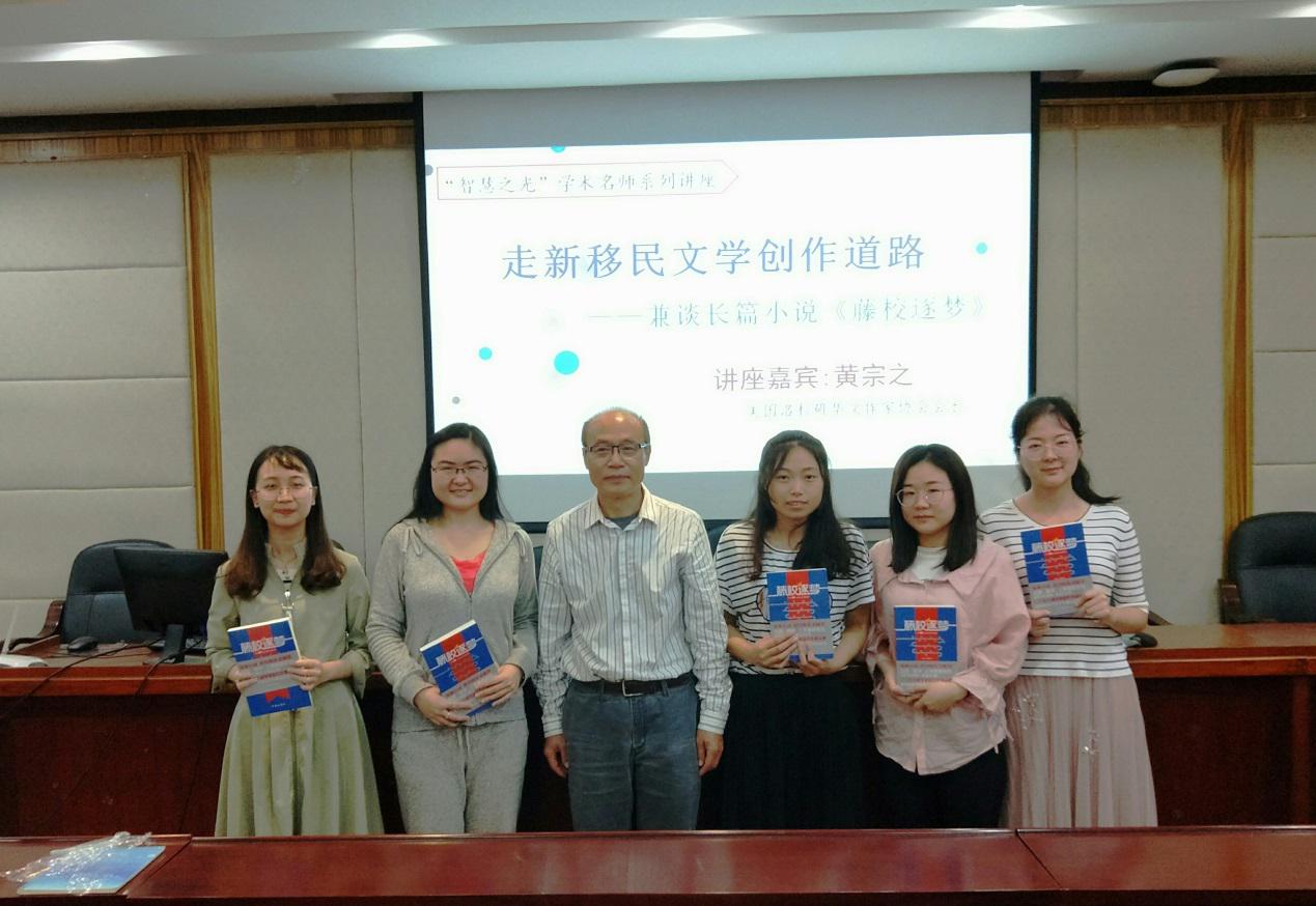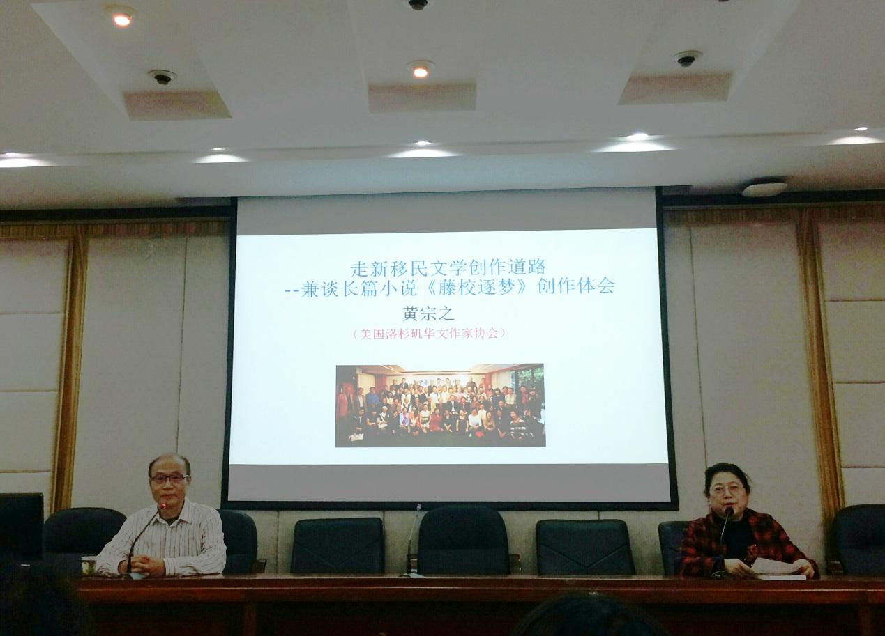 黄宗之深刻解读了新移民文学创作。他说,新移民文学创作应当透过表面的社会现象深挖主题思想,同时,突出正能量,塑造中国人的鲜活形象。他指出,想要走出新移民文学题材匮乏的困境,就要走出华人狭窄的文化圈子,深入观察美国社会,与各族裔移民接触,这样才能写出与新移民生活息息相关的作品。黄宗之还根据自己创作的《藤校逐梦》作品,与在场同学分享了自己创作长篇小说经验,以及对出国留学与教育的思考。