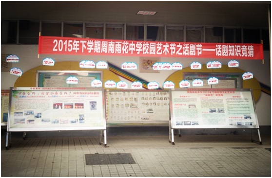 本次周南雨花中学校园首届话剧节分为宣传发动、初赛选拔和决赛展示三个阶段。在“话剧节”的前期筹备和宣传发动阶段,学校通过以“话剧”为主题的黑板报评比、文化长廊、话剧知识竞猜和经典话剧赏析等一系列活动,让实习队队员全程协助参与其中,做到真正了解话剧,走近话剧,爱上话剧。