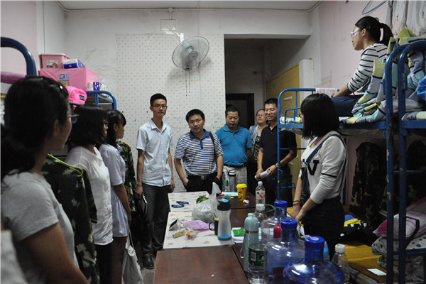 走进宿舍楼,每到一个寝室,领导们仔细询问员工到校情况及对校园的感受。郑贤章及各位领导主要从三个方面对新生给出建议。首先,告诉新生要尽快完成从中学到大学的转型,以最快的速度适应新的环境、新的生活。其次,叮嘱新生大学期间最重要的还是学习:“在军训15天内,好好思考,摸索大学四年要走的路,要多读经典名著,多借书、多买书、多看书。大学的学习不像中学。这学期会开很多新的课程,要尽快适应。”再者,鼓励新生多进行体育锻炼,加强身体素质并反复叮嘱新生注意人身安全、财产安全。
