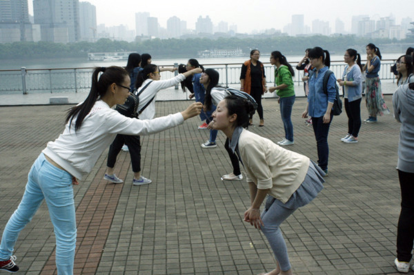 活动第一阶段,工作人员向全体参与人员解释活动开展方式及规则,各队选出本队队长,队长组织队员选定队伍口号、创作队旗,并对本队队旗进行讲解。活 动第二阶段,各队合作完成摇摆棉花糖、合力吹气球等趣味游戏。第三阶段的活动为运气实力大比拼,各队分别选择一种不同颜色的卡片,并完成卡片上的任务。任 务完成后,按照到达指定地点的速度,对最后到达的队伍进行惩罚,并将四支队伍重新分组,进行第四阶段的活动——绑腿接力赛。活动的第五阶段为同甘共苦,即 最后一名到达终点的队伍,全队成员嘴里含着水合唱一段歌曲作为惩罚。在活动过程中,大家笑声不断,氛围融洽。