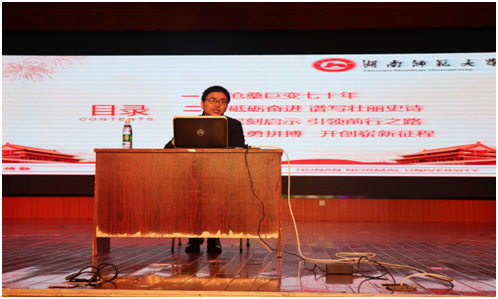 郑贤章从观看国庆70周年阅兵式的亲身感受出发,引出“辉煌七十载”的主题,从沧桑巨变七十年、砥砺奋进谱写壮丽史诗、深刻启示引领前行之路、奋勇拼搏开创崭新征程四个方面分析我国形势与政策的改革发展,讲述了我国从站起来到、富起来再到强起来的伟大飞跃;同时,以“奋斗新时代”为主题激励同学们要自觉做中国共产党的拥护者、做社会主义现代化的建设者。他希望同学们在未来的大学时光里能够进一步明确自身的历史责任和时代使命,刻苦读书、勤勉向学。
