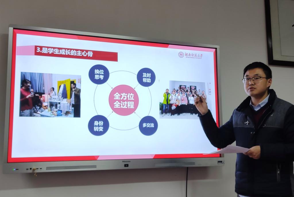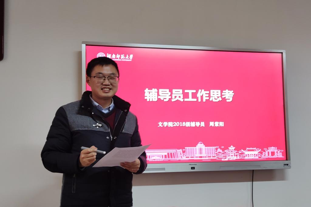 2018级辅导员周紫阳老师做了题为《辅导员工作思考》的分享。他从思政教育、学情分析、日常管理、家校联系等方面分享了自己两年来的做法和经验,激情澎湃,干货满满。随后,大家就管理工作进行了交流和探讨。
