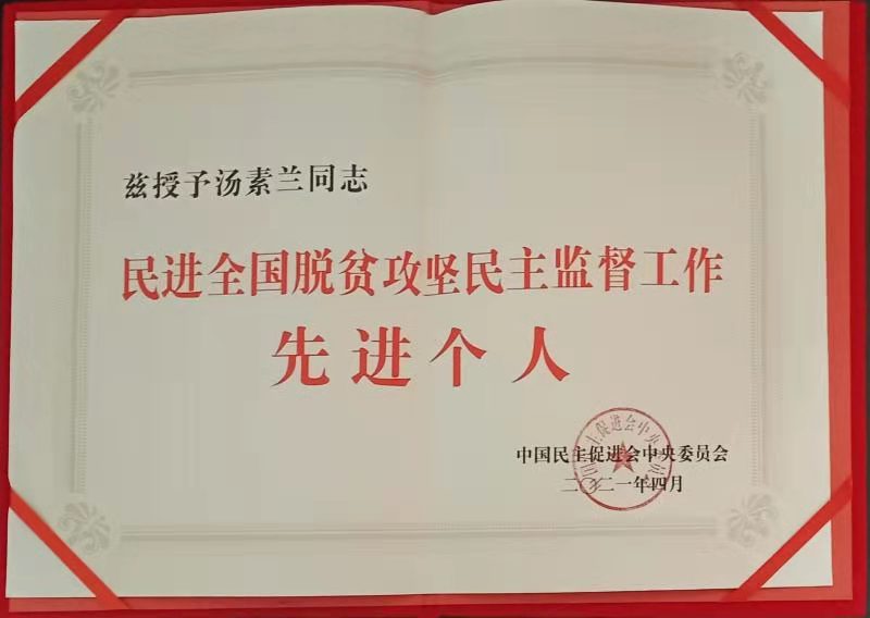 据悉,按照中共中央决策部署,民进中央自2016年开始对口湖南省开展脱贫攻坚民主监督工作。汤素兰教授响应组织号召,全力投入,发挥优势,积极作为,为脱贫攻坚工作注入民主监督之力。