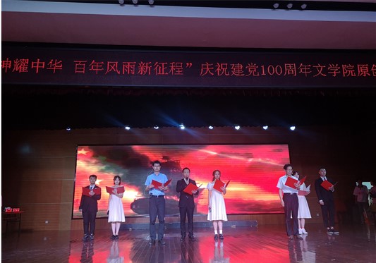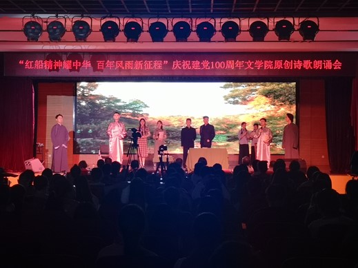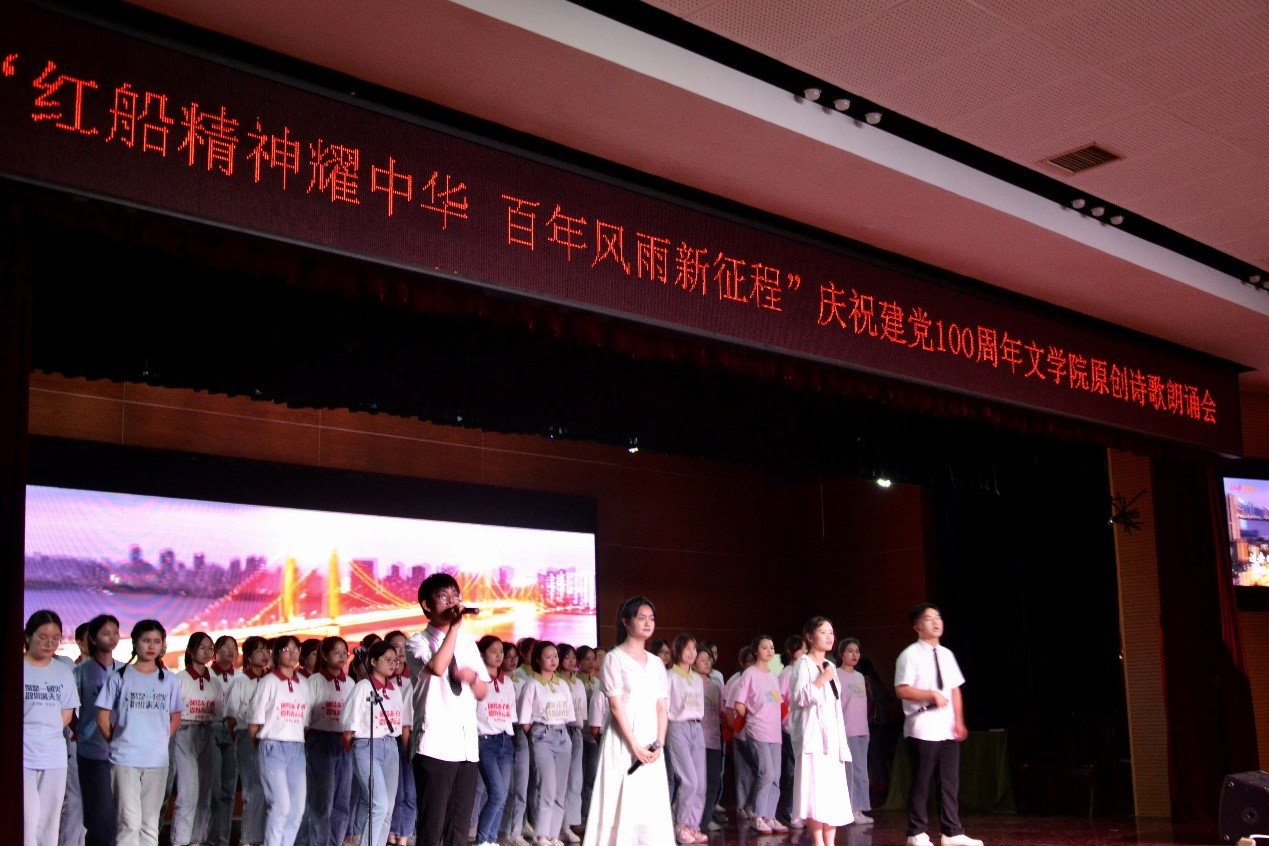 2020级戏剧影视文学班带来的《永不消逝的电波》中,以李侠和兰芬的爱情故事展现了在危险年代共产党人高尚的革命情操。《红色湖南赋》体现出湖南红色基因早已伴随奔腾不息的湘江水深深融入三湘儿女的精神血脉。《踏山河》展现了中国百年前的生灵涂炭与百年后的繁荣富强。《辉煌百年,党耀中华》体现出在中国共产党的领导下,十四亿中国人民中坚定信心、鼓足勇气,凝聚起众志成城、一往无前的磅礴伟力。《牵着你的手走进党》以入团的故事讲述了共产党的发展。《辘轳体七律—为党百年华诞而作》传达了共产党人威武不屈的革命意志以及用于改革创新的精神。《灯火里的中国》展现了在中国共产党的带领下,人民过上了幸福生活。