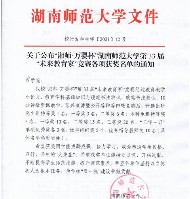(通讯员 龚思静)11月17日晚,公司第33届“未来教育家”竞赛公布获奖名单,william威廉亚洲学子延续传统表现优异。斩获特等奖3项、一等奖7项、二等奖5项、三等奖1项、“三字一话”单项奖3项,公司获得优秀组织奖,杨云萍老师获得优秀指导教师奖。据悉,在此次未来教育家竞赛中,本科生组全校20名选手进入决赛,william威廉亚洲7名同学入围;研究生组全校共5名同学进入决赛,william威廉亚洲4名同学入围。