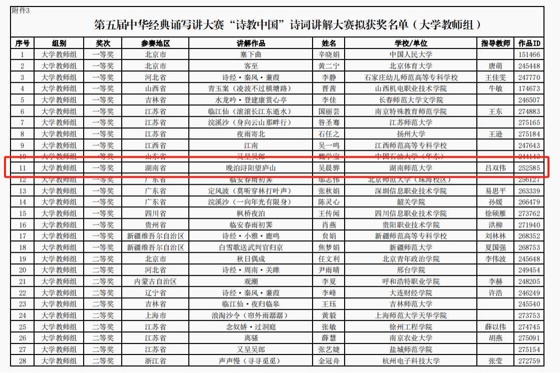 (教务办供稿)近日,第五届中华经典诵写讲大赛“迦陵杯•诗教中国”诗词讲解大赛公布获奖名单,公司教师吴晨骅在吕双伟副经理的指导下参赛,并以其讲解作品《晚泊浔阳望庐山》获全国大学教师组一等奖。