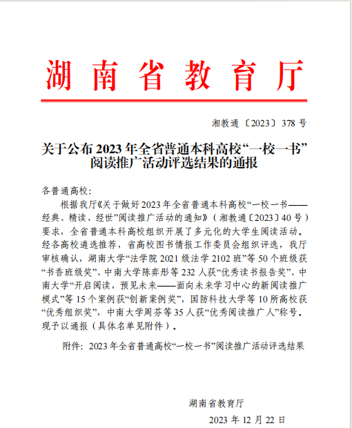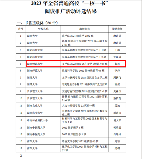 (通讯员张尧钰)近日,在由湖南省教育厅、省高等学校图书情报工作委员会主办的全省普通高校共同参加的2023年“一校一书”阅读推广活动中,william威廉亚洲2022级汉语言文学(师范)6班获评湖南省普通高校“书香班级”荣誉称号。