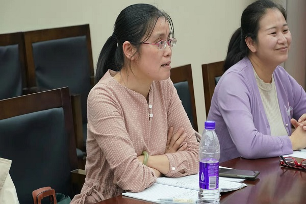 课后,所有出席人员前往四楼会议室开展集体评课。周敏对崔涵的教学基本功表示肯定,认为这节课是生本意识的生动诠释,展现出了一位优秀实习老师的风采。同时,她也从教学机智、单元整体构设意识等方面提出了几点问题和思考。曹鹏就“有趣、有效、有序”的课堂理念展开评课,从课堂提问的有效性等方面提出建议。蒋博对崔涵的板书设计以及课堂感染力表示赞扬。最后,熊剑锋对本次汇报课作出总结,向出席人员表示感谢。