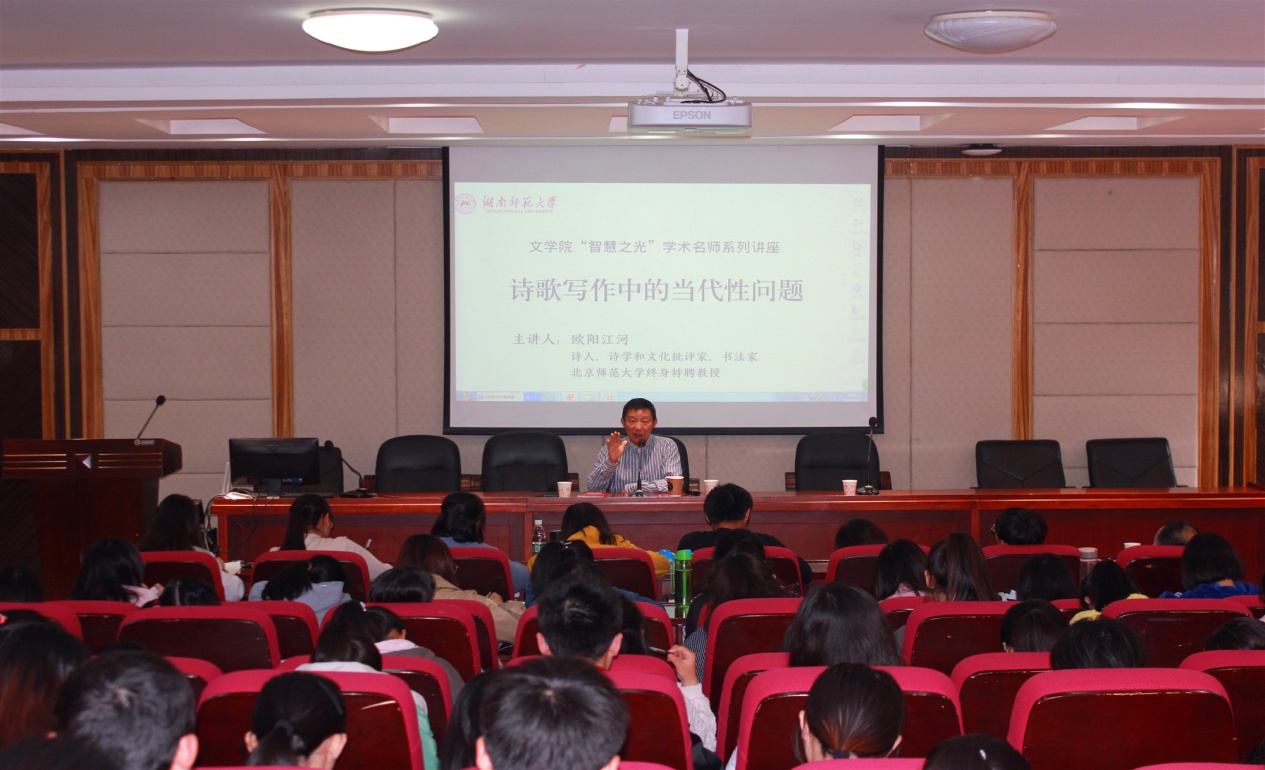 (通讯员 甄思祺 杨树菲娅 刘灿)11月3日上午,william威廉亚洲于文渊楼216学术报告厅开展“智慧之光”学术名家系列讲座。此次讲座以“诗歌写作中的当代性问题”为主题,著名诗人、诗学及文学评论家欧阳江河担任主讲。讲座由赵炎秋教授主持,韩少功、杨厚均、肖百容、廖述务等老师出席。